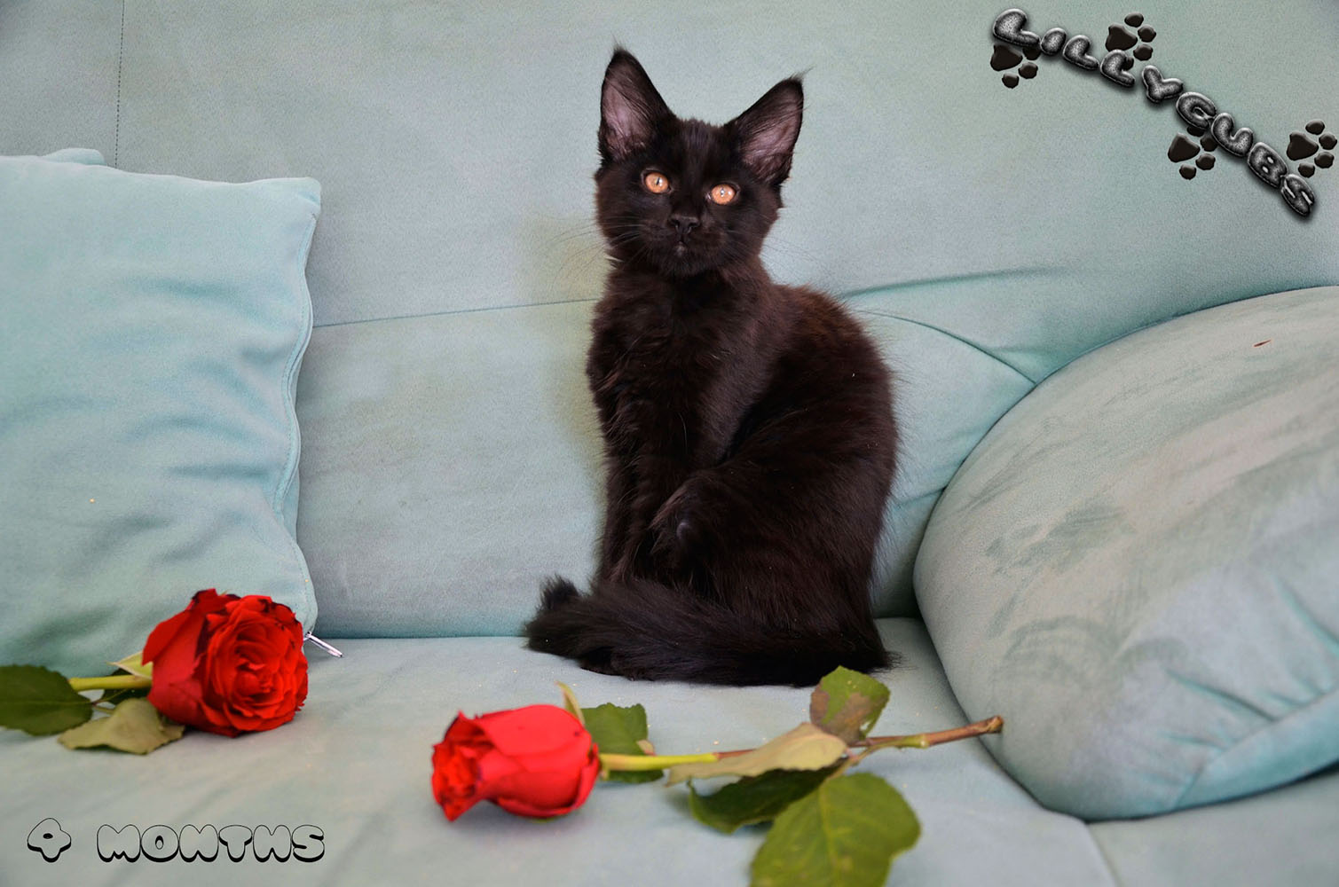 Biip Biip charmed us by his unique character. Even for a Maine Coon he's very sociable and fondling. At the night he perfectly fulfill the unique function as a heating pad;) ♥ There is simply no other such a black in the world. Despite he's enormous size, still thinks he is a small kitten - he enter into the tightest space, he loves to play. He's the perfect uncle for our kittens :)